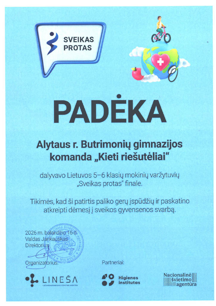 Balandžio 16 d. Vilniuje, Lietuvos neformaliojo švietimo agentūroje (LINEŠA), vyko nacionalinio žinių konkurso „Sveikas protas“ finalas, į kurį susirinko net 10 komandų iš visos Lietuvos. Butrimonių gimnazijai atstovavo 5 klasės mokinių komanda „Kieti riešutėliai“ – Lėja Lukošiūnaitė, Deivydas Zajančkauskas, Olivija Lukošiūnaitė, Paula Anušauskaitė ir Justė Dobravolskaitė (klasės vadovė Dalia Adžgauskienė). Į finalą mokiniai pateko sėkmingai įveikę pirmąjį ir antrąjį konkurso etapus.