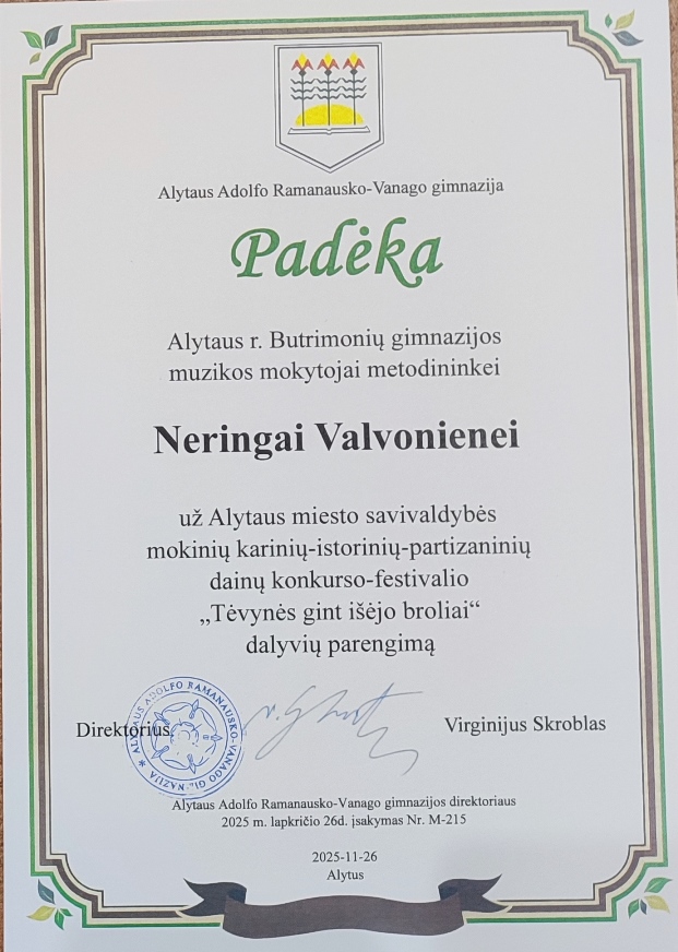 Lapkričio 26 d. Butrimonių gimnazijos mišrus vokalinis ansamblis dalyvavo Alytaus Adolfo Ramanausko-Vanago gimnazijos organizuotame karinių-istorinių-partizaninių dainų festivalyje „Tėvynės gint išėjo broliai“, skirtame paminėti Adolfo Ramanausko-Vanago 65 –ąsias žūties metines. Festivalio tikslas – ugdyti jaunosios kartos patriotines nuostatas, puoselėti tautinius jausmus ir istorinę atmintį,  ugdyti pagarbą ir pasididžiavimą savo Tėvyne, savo tautos didvyriais, populiarinti lietuviškas patriotines dainas.