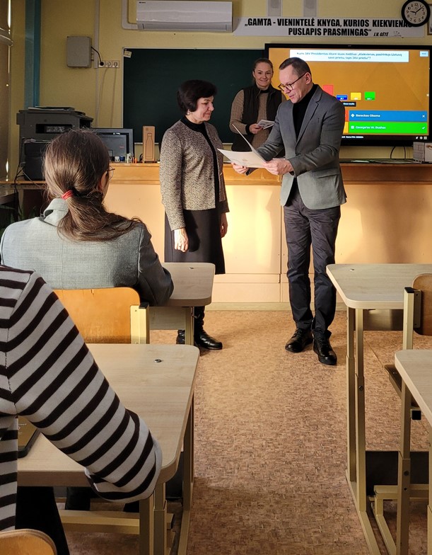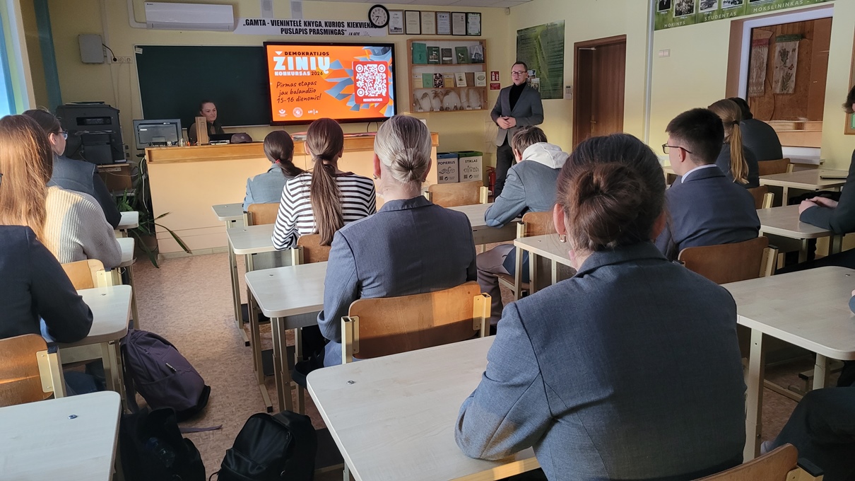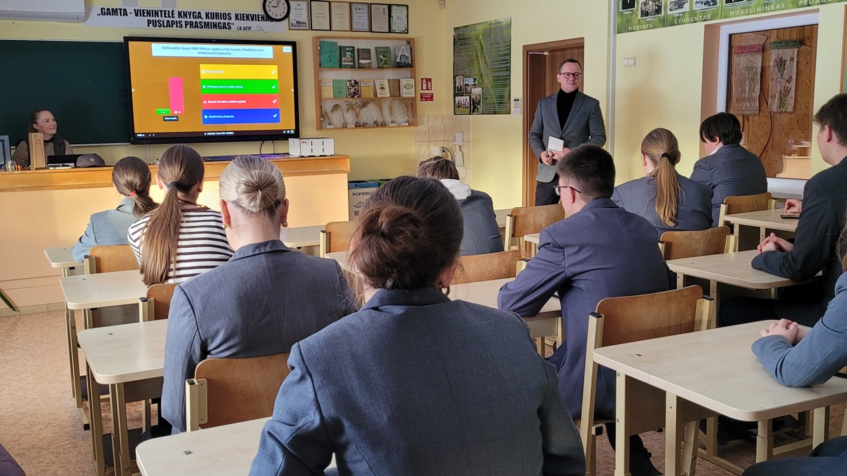 Pamokos metu mokiniams buvo surengtas interaktyvus žaidimas, kuriame jie pasitikrino žinias apie Lietuvos politiką ir istoriją, Konstituciją bei pilietinį dalyvavimą. Geriausiai pasirodžiusiems mokiniams įteikti prizai.
