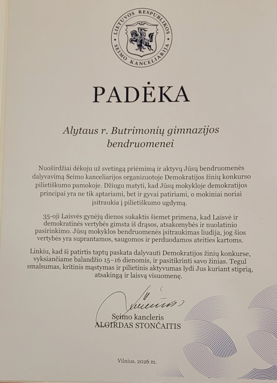 Vasario 10 d. gimnazijoje lankėsi Informacijos ir komunikacijos departamento Seimo lankytojų centro biuro vyriausioji specialistė Ingrida Česokė bei patarėjas Artūras Svarauskas. Jie gimnazistams vedė pilietiškumo pamoką ir pristatė Demokratijos žinių konkursą, paaiškino, kada ir kaip jame galima dalyvauti.