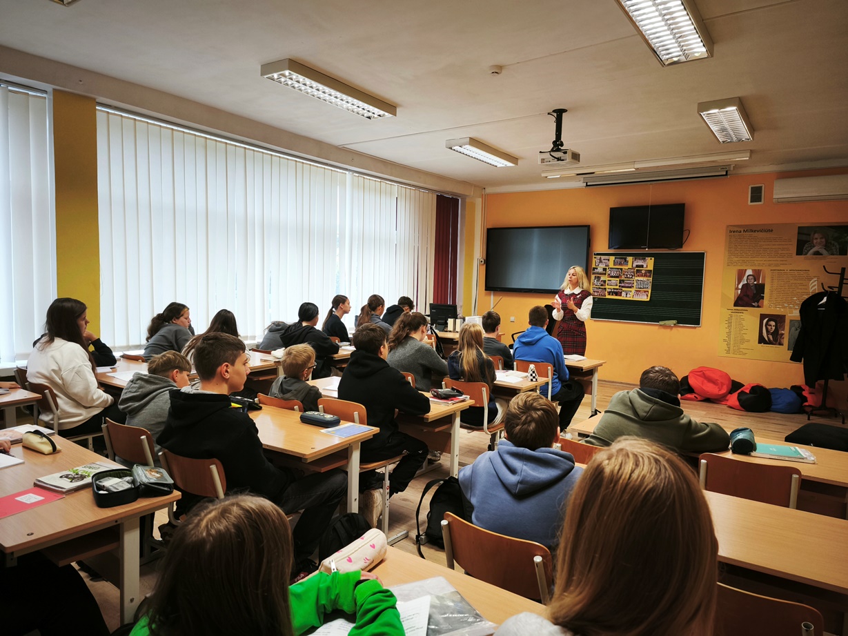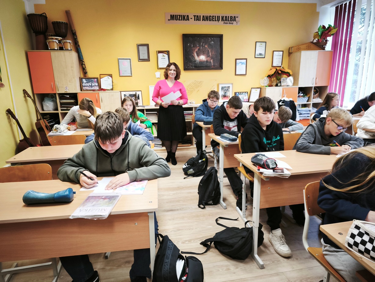 Minėdami Lietuvių liaudies dainų metus, spalio 15 d. gimnazijos septintokai dalyvavo integruotoje literatūros-muzikos pamokoje „Liaudies dainos – tautos savitumo atspindys“. Po trumpos įžangos mokiniai mokėsi atpažinti lietuvių liaudies dainų temas, simbolius ir poetines priemones, stengėsi išgirsti ir apibūdinti liaudies dainų muzikinius bruožus (melodiją, ritmą, atlikimo būdą), diskutavo, kaip muzika ir žodis kuria emociją bei tautinį tapatumą. Vadovaujami muzikos mokytojos Neringos Valvonienės ir literatūros mokytojos Irenos Šimanskienės, septintokai kūrybiškai interpretavo liaudies dainą – mokėsi dainuoti dzūkišką dainą, surado ir įvardino meninės raiškos priemones.