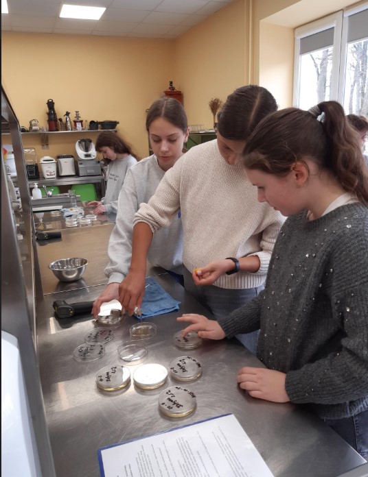 Edukacijoje ,,Mikrobų detektyvai” mokiniai galėjo atidžiau pažvelgti į galimą kryžminę maisto taršą gamybos metu, rankų higienos svarbą bei gamybinių paviršių mikrobiologinės taršos svarbą.