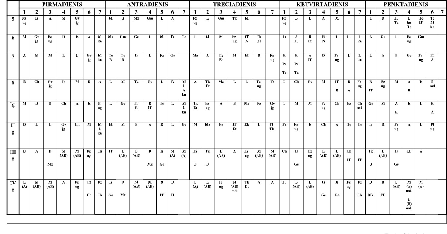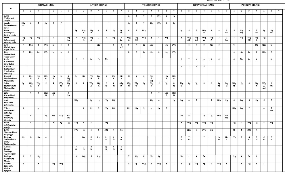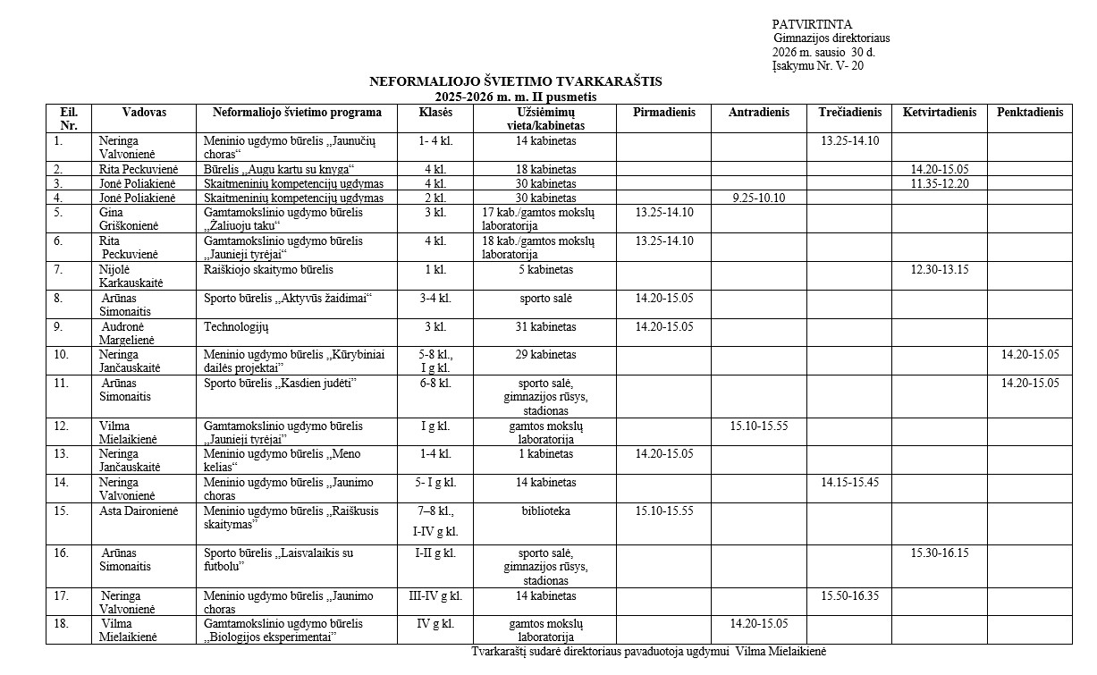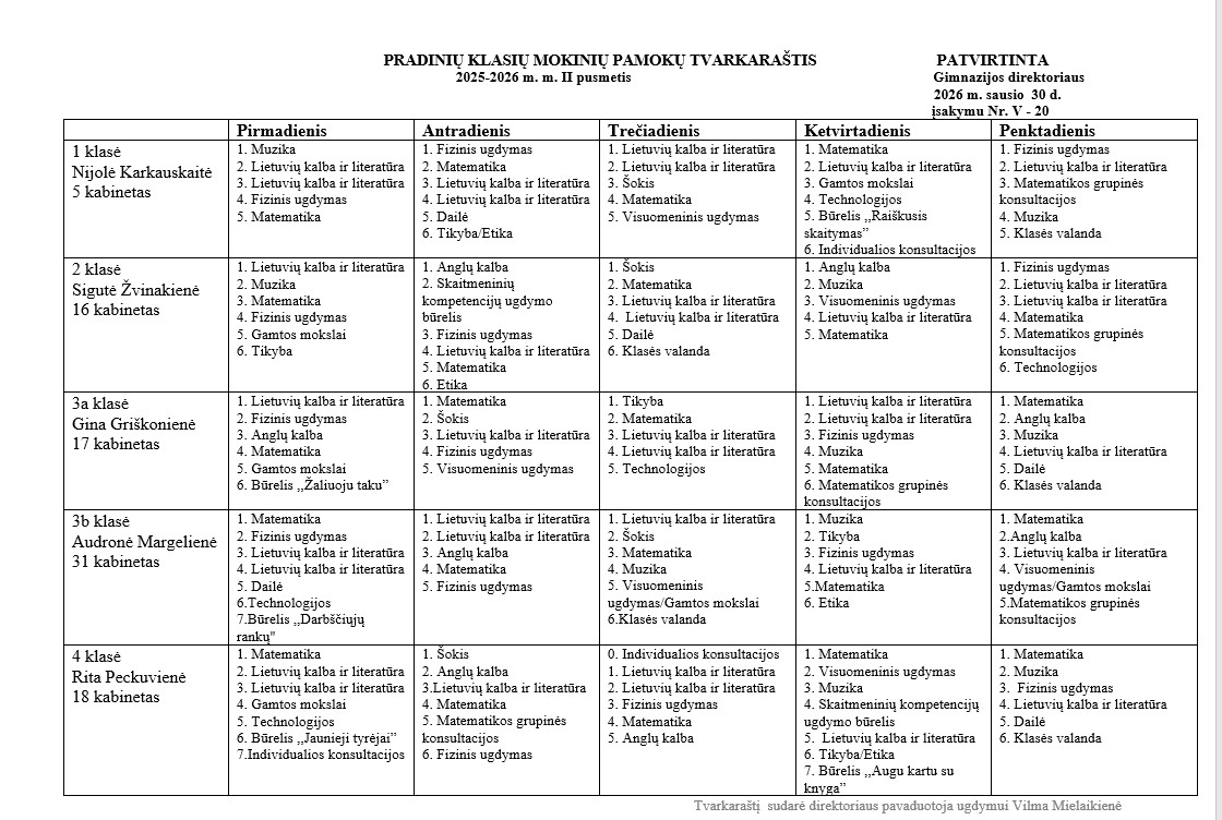 Pamokų tvarkaraščiai 2025-2026 m. m. II pusmečio mokytojų tvarkaraštis 2025-2026 m. m. II pusmečio 5-8, I-IV g kl. mokinių pamokų tvarkaraštis 2025-2026 m. m. II pusmečio 1-4 klasių mokinių pamokų tvarkaraštis 2025-2026 m. m. II pusmečio neformaliojo ugdymo tvarkaraštis Alytaus r. Butrimonių gimnazijos sporto salės ir kitų sporto erdvių užimtumo grafikas Brandos egzaminų, PUPP ir kitų patikrinimų tvarkaraščiai 2025–2026 mokslo metų brandos egzaminų tvarkaraščiai PUPP tvarkaraštis 2025-2026 m. m. NMPP tvarkaraštis 2025-2026 m. m.