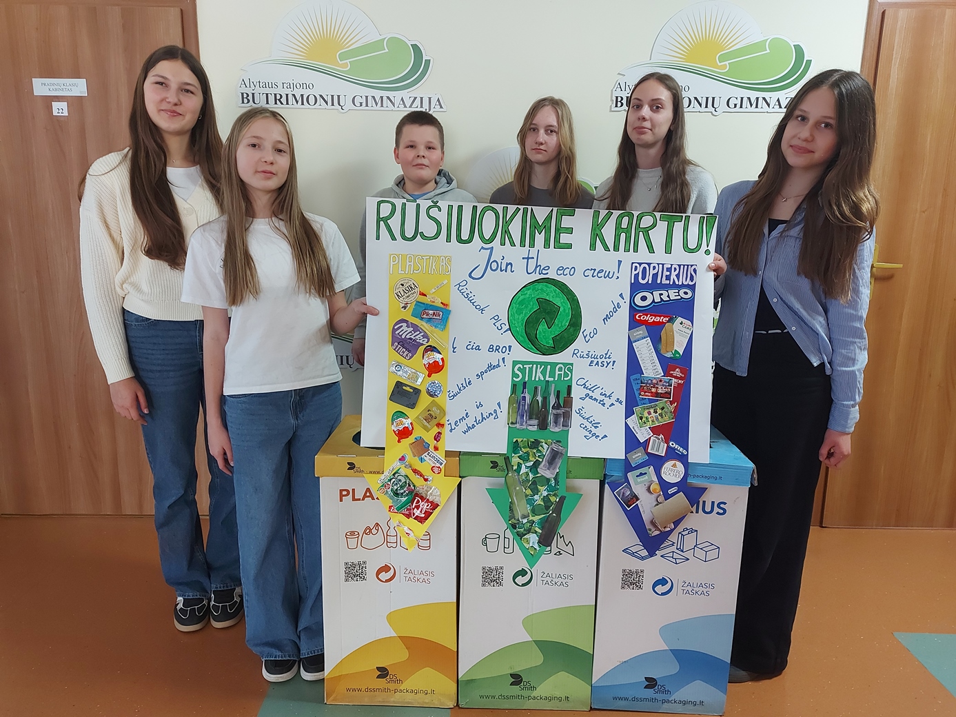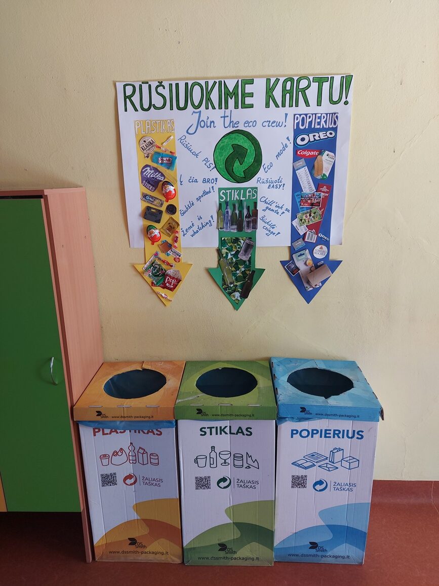 6 ir 7 klasių mokinių komanda „Žaliasis žingsnis“ dalyvauja aplinkosauginiame konkurse „Žalioji odisėja, Jaunučiai‘26“. Konkursui paruošėme teisingą atliekų rūšiavimą skatinantį plakatą. Jam sukurti panaudotos mokinių surinktos įvairių produktų pakuotės, kurios vaizdžiai parodo, kaip atliekos gali būti suskirstytos pagal rūšis. Pasirinktos būtent tokios pakuotės, kokių produktus dažniausiai perka patys mokiniai, todėl plakatas tampa artimas ir lengvai suprantamas. Aiškios spalvos, rodyklės ir realūs pavyzdžiai padeda greitai suprasti, kur turi keliauti plastikas, stiklas ir popierius. Jaunatviški posakiai bei lietuvių ir anglų kalbų derinys suteikia plakatui žaismingumo ir skatina jaunus žmones prisijungti prie rūšiavimo idėjos.